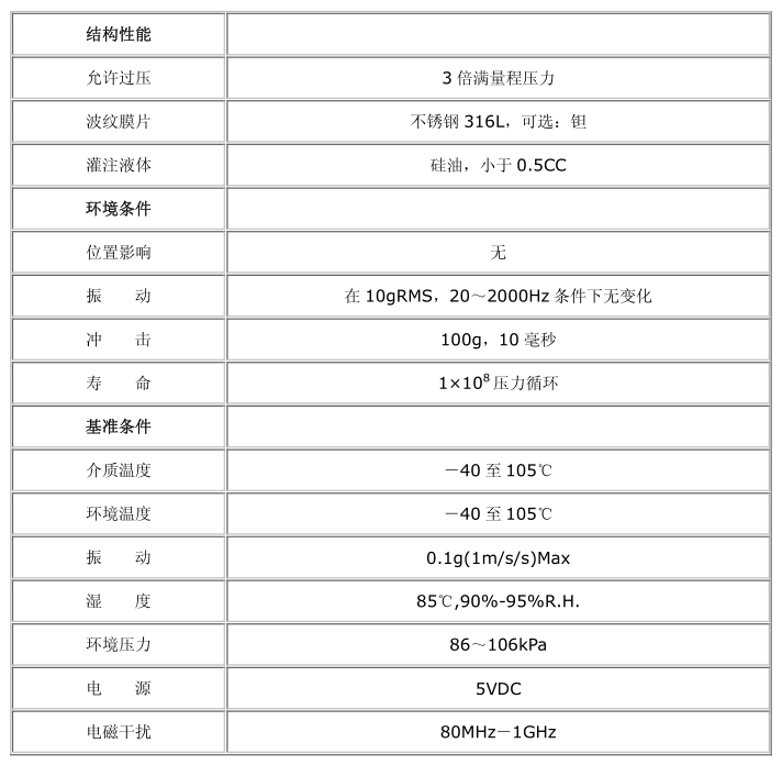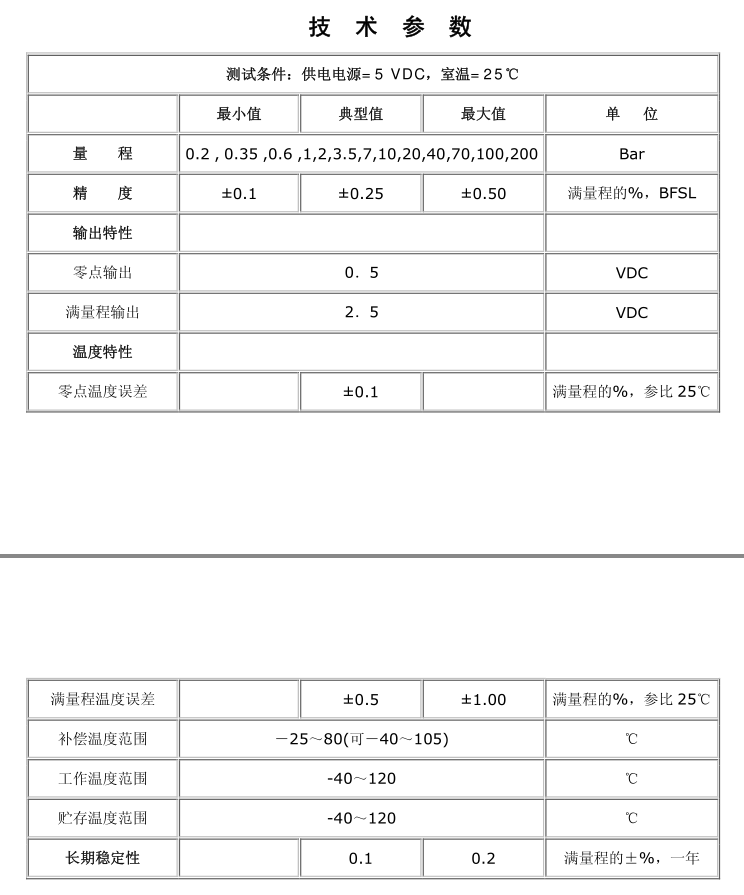 是將充油擴散硅壓力傳感器芯體,通過激光焊接方式,裝入特定螺紋的壓力接口中組成。所有產(chǎn)品經(jīng)嚴格測試和篩選,利用MAX1452專用芯片進行溫度補償和非線性校正,典型精度為0.25%,最高精度優(yōu)于0.1%,并保證在-25到80度工作溫區(qū)(最大可在-40到105度),全溫區(qū)測量精度在1%以內(nèi),5V供電,輸出0.5-2.5V電壓信號,適用于各種不同壓力測量產(chǎn)品的組裝和生產(chǎn)。