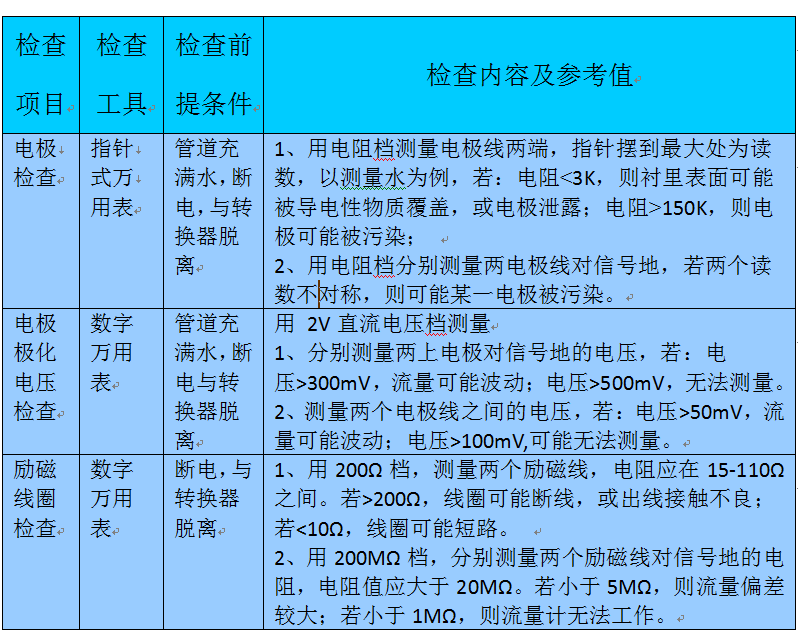 1、電阻法:信號線、勵磁線的通斷;勵磁線圈的通斷、電極對稱性測量;電極對地的絕緣電阻;勵磁線圈對地的絕緣電阻